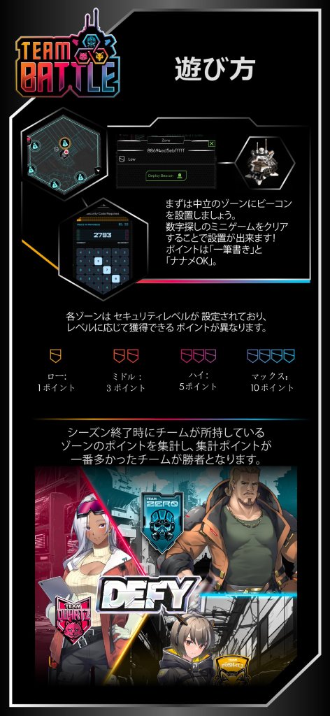 新たに実装されたチームバトルはいわゆる「陣取りゲーム」です。DEFYは元々位置情報に基づいてマップが六角形のエリアに分割されておりそのエリアに落ちてるアイテムを拾ったりハッキングするという仕様でした。これがチームバトルでは各エリアが3つのチームごとの陣地となり、ビーコンというアイテムを使って陣地を取り合っていくゲームとなります。