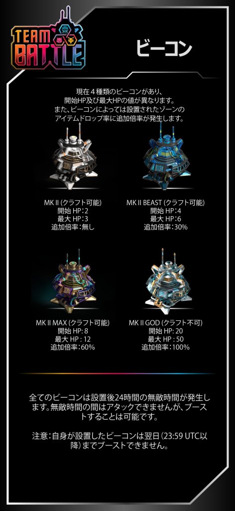 ビーコンは4つのレアリティが存在し、コモン(MK II)〜レジェンダリー(GOD)まであります。簡単にいうと、レアリティの高さ=エリアの耐久度です。置かれたビーコンによってそのエリアのHP(耐久度)が設定されます。HPは味方チームのチェックイン(ブースト)で1回復し、敵チームによるチェックイン(攻撃)で1減少します。