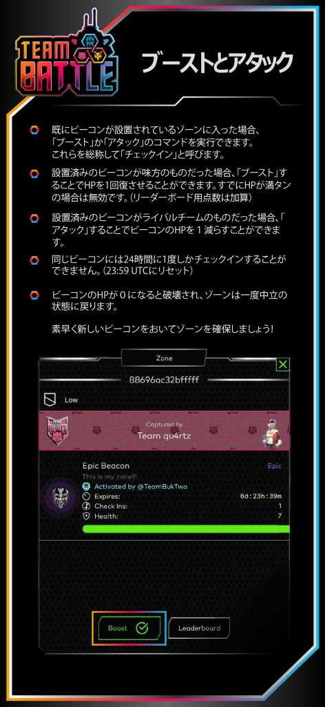 ブーストとはこのHPを回復させる動作であり、敵チームに上書きされるのを防ぐ「防衛行為」です。通常1エリアにつき12時間に1回ブーストをすることができます。(定時回復ではなくブーストしてから12時間なので)