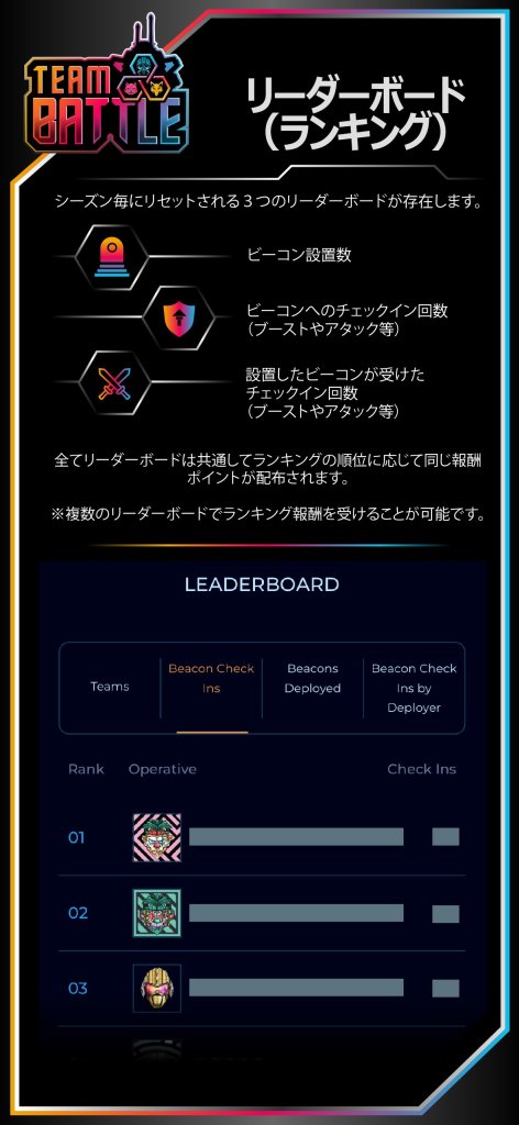 ①ビーコンのチェックイン数:エリアに対してブースト(回復)、攻撃、ビーコンの設置をした回数