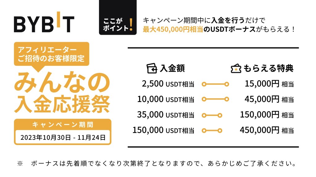 現在Bybitでは入金キャンペーンが開催中です。以下のリンクからキャンペーンに参加登録頂くと漏れなく入金ボーナスがあります(ただし先着で終了!)。ボーナス分は取引の証拠金として使用できるので純粋に原資増分として使用できるので参加できる人はやっておきましょう!