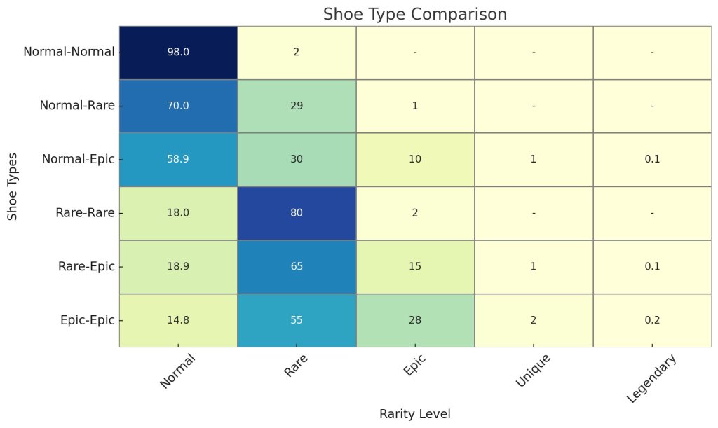 靴を増やす手段としてはミントの方が経済的ですが、ミントの醍醐味はやはり「上振れ」ですね!靴もエナも増やしたい人は上振れ狙いで、ノーマル×エピミントでも1%でユニーク、0.1%でレジェンダリーが出ます!レジェンダリーは100万円前後で取引されることもあるので、夢があります。