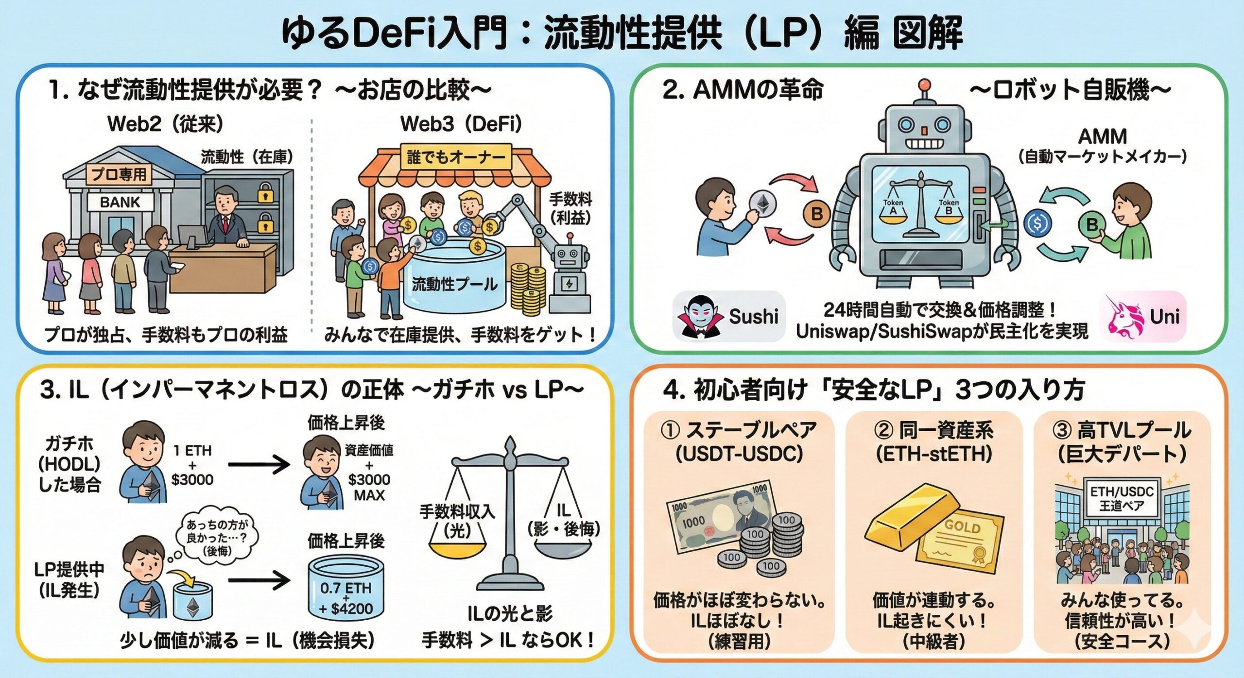 ・LP(流動性提供)は「取引の裏側を支える側」に回ることであり、それによって手数料収益を得られること。