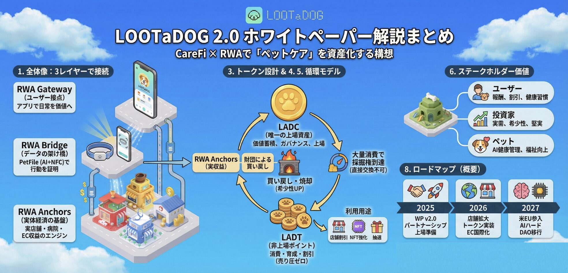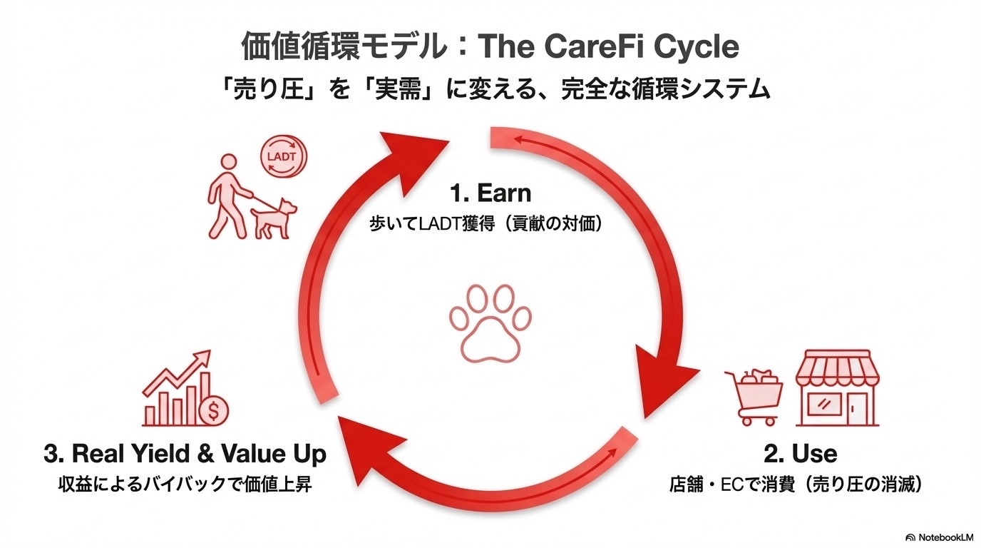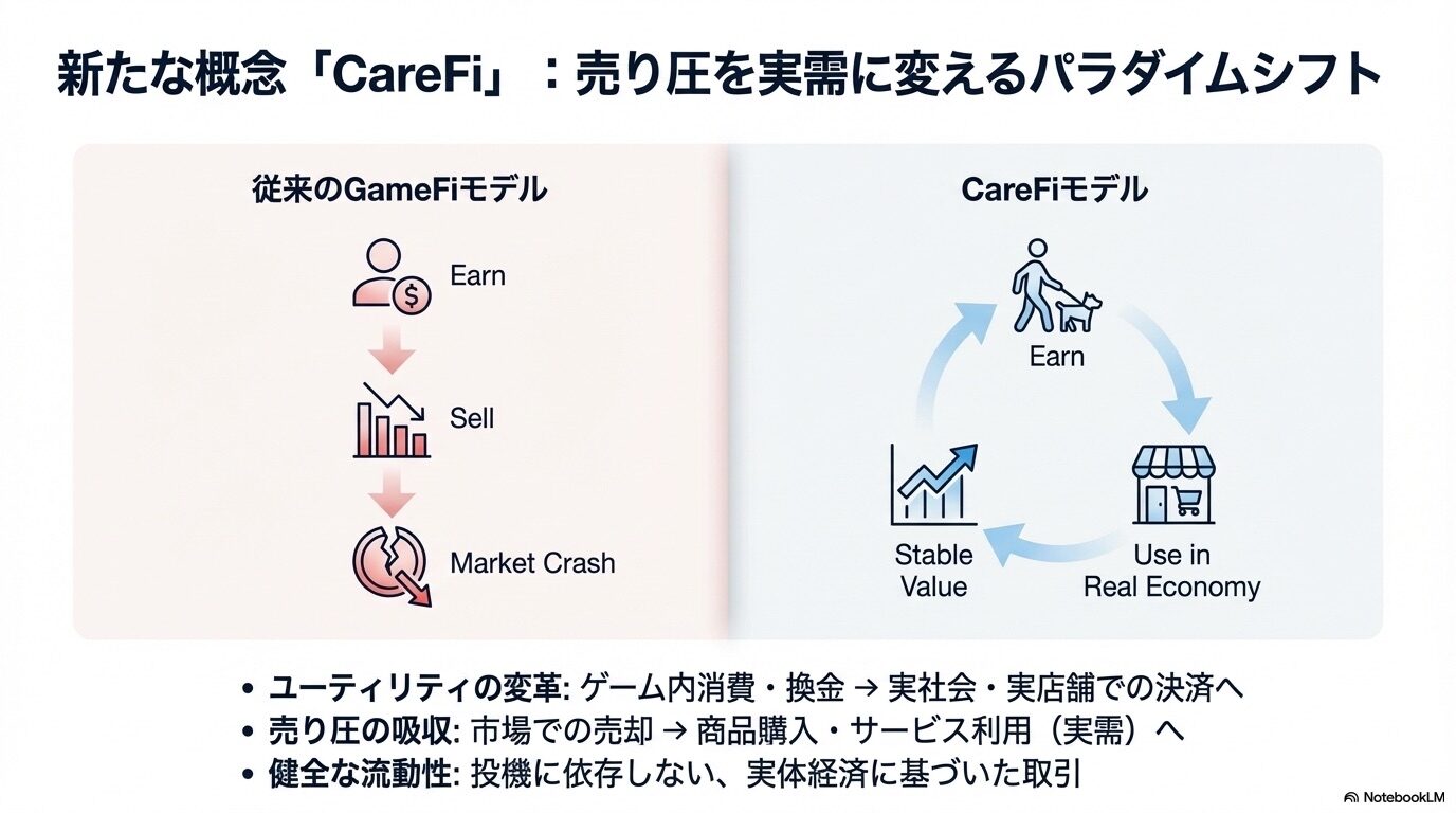 LOOTaDOG 2.0は、ペット産業の実収益(オフライン店舗やEC等)と、Web3の流動性・トークン設計をつなぐ「CareFi(ケア行動を価値化する金融)」+「RWA(現実資産の裏付け)」エコシステムです。最大の狙いは、投機や過剰発行に依存しがちな従来のP2Eモデルから脱却し、実需とキャッシュフローで回る経済圏を作ることにあるように見えます。