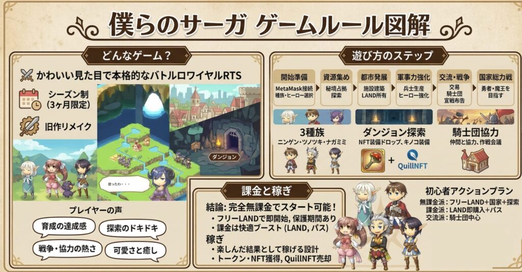 では、僕らのサーガはどんなゲームなのか。公式情報ベースで整理すると、旧作「僕らのサーガ」をベースにしたシーズン制のブロックチェーンRTSです。プレイヤーは自分の領地で都市を発展させ、資源を集め、兵士や英雄を育成しながら、他プレイヤーとの戦争や国家戦に参加していきます。